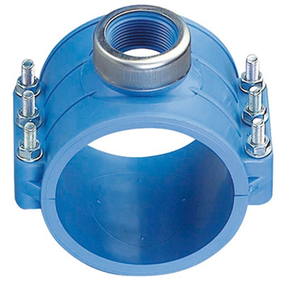 Anborrningssadel typ 654 av PP med invändig gängat avstick med förstärkningsring av rostfritt stål. Tätning av NBR. 6 st bultar av rostfritt stål.