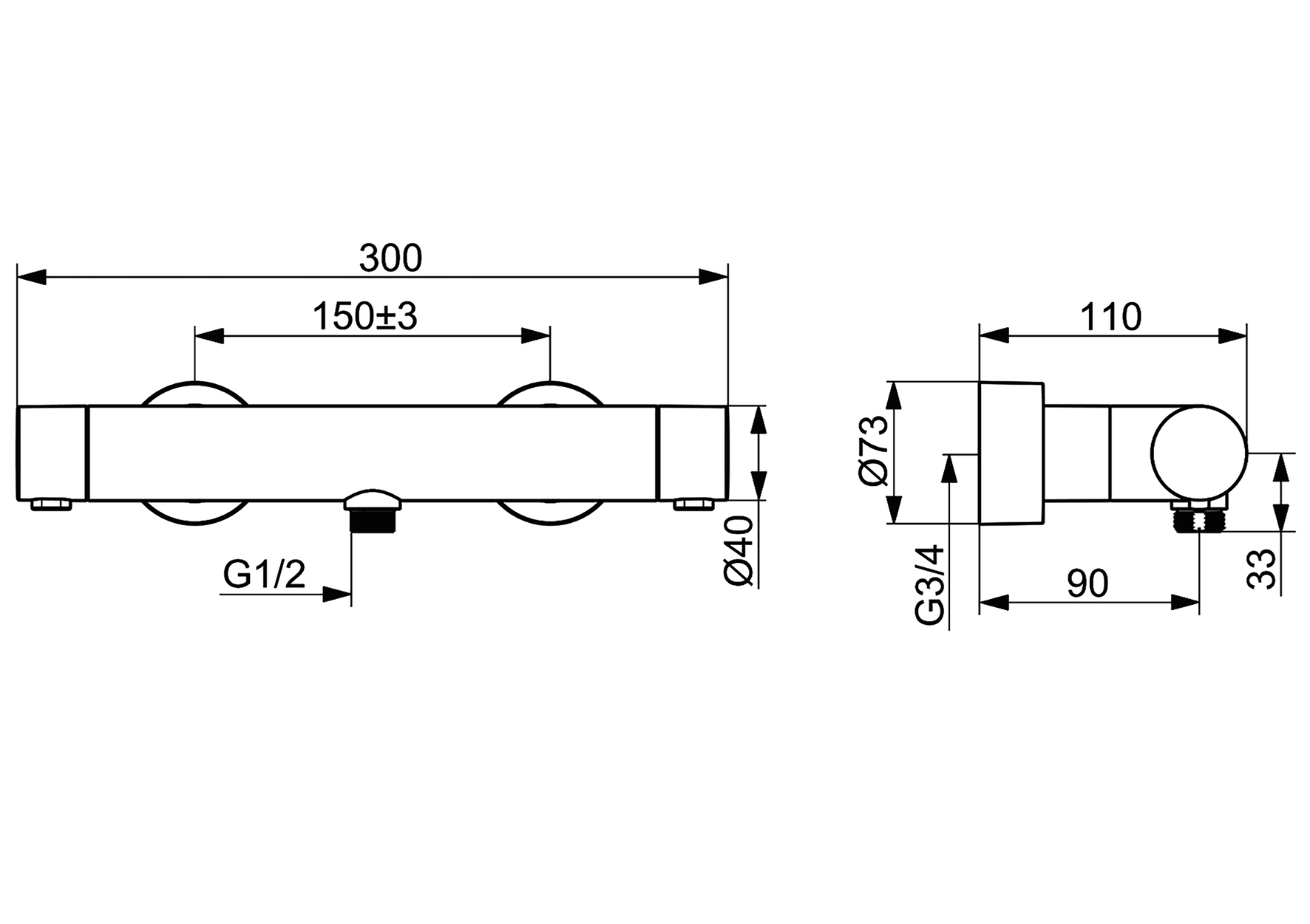 Termostatblandare för dusch, anslutning 150cc med G 3/4″ inv.g., lekande mutter med plantätning. Användarvänliga vred med temperaturbegränsnings knapp 38°, kontroll för flöde med eco-flödesläge. Blandaren är utrustad med backventiler och smutsfilter.