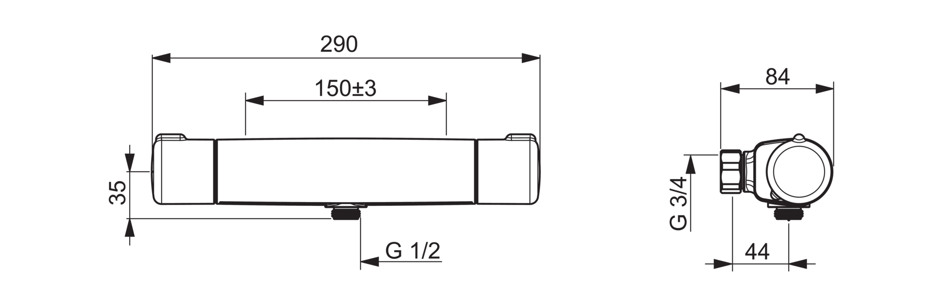 Termostatblandare för dusch. Temperaturvred med säkerhetsspärr vid 38°C, volymvred med kontroll för Ecoflöde, keramisk överdel. Blandaren är utrustad med backventiler och smutsfilter.