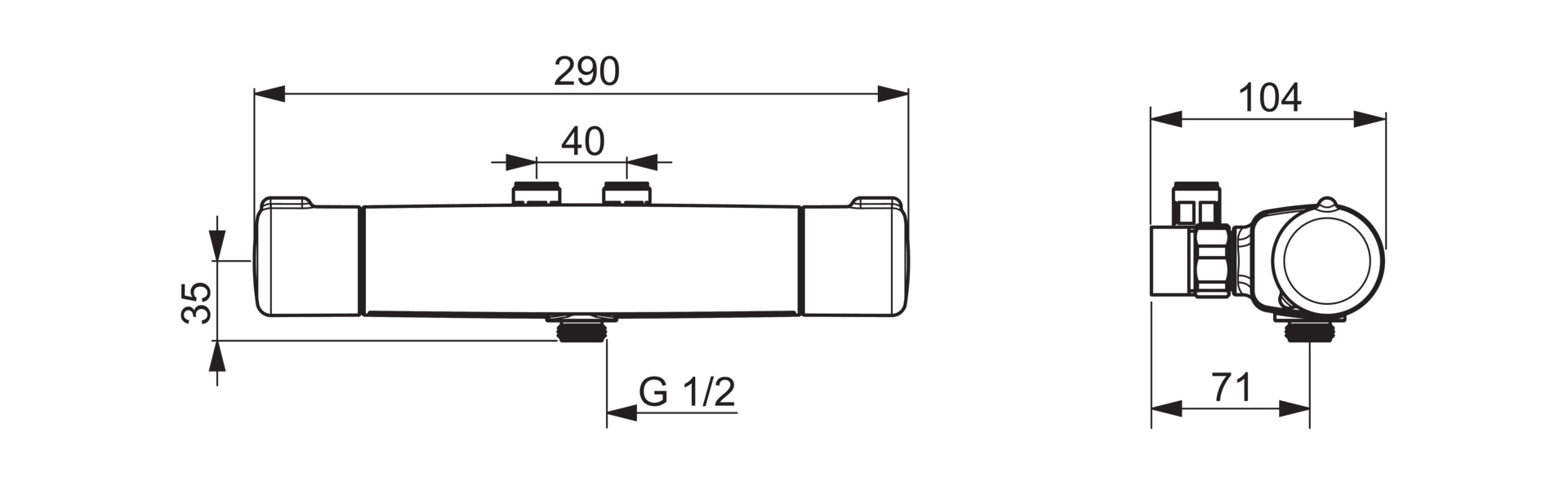 Termostatblandare för dusch. Temperaturvred med säkerhetsspärr vid 38°C, volymvred med kontroll för Ecoflöde, keramisk överdel. Blandaren är utrustad med backventiler och smutsfilter.