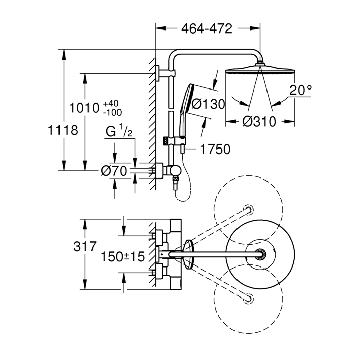 Rainshower SmartActive 310, Duschsystem med termostat för väggmontage, phantom black, Bestående av: Horisontellt svängbar 450 mm duscharm Termostatblandare med Aquadimmer-funktion Möjliggör byte mellan: head shower Rainshower Mono 310 Med kulled Vridningsvinkel ± 15° hand shower Rainshower SmartActive 130 (22 127 KF0) Justerbar i höjd med glidande element Inklusive prestanda-grepp Silverflex duschslang 1750 mm (28 388) GROHE TurboStat kompakt insats med vaxbaserad keramisk kropp GROHE SafeStop vid 38° C GROHE SafeStop Plus valfri extra temperaturbegränsare vid 43°C inkluderad GROHE Cooltouch – ingen risk för brännskador GROHE DreamSpray GROHE SmartTip val av strålmönster via tryckknapp GROHE Long-Life-beläggning GROHE Water Saving 9,5 l/min flödesbegränsare GROHE FastFixation övre fäste justerbart SpeedClean antikalksystem Kan användas med genomströmningsberedare Minimumflöde 7 l/min