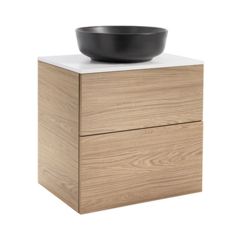 Isella underskåp med bänkskiva och ovanpåliggande tvättställ. Bänkskivan är gjord av kvartskomposit och tvättställ i porslin. Underskåpen har mjukstängande lådor. Mått (BxDxH) på tvättställ: Runt 415x415x135 mm och Rektangulärt 455x325x135 mm. Handtag beställes separat. Mått bakkant låda till vägg: 50 mm.