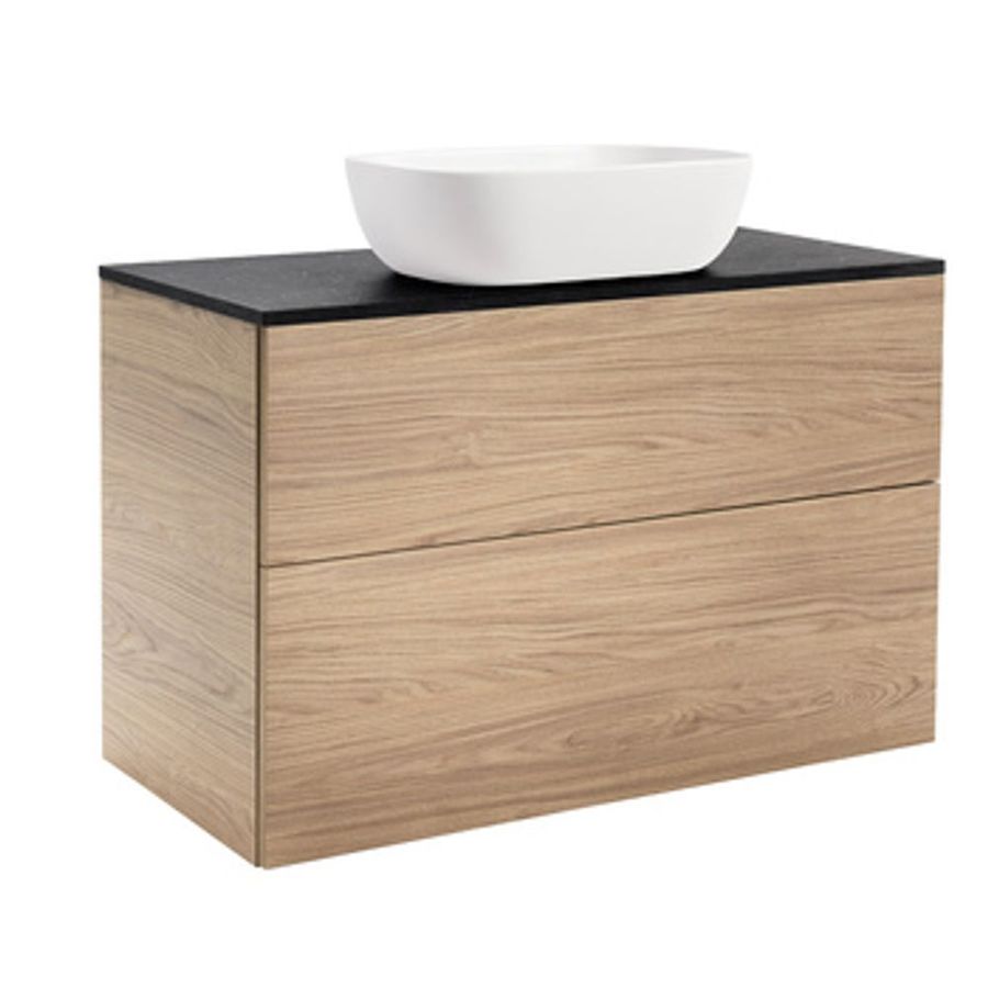 Isella underskåp med bänkskiva och ovanpåliggande tvättställ. Bänkskivan är gjord av kvartskomposit och tvättställ i porslin. Underskåpen har mjukstängande lådor. Mått (BxDxH) på tvättställ: Runt 415x415x135 mm och Rektangulärt 455x325x135 mm. Handtag beställes separat. Mått bakkant låda till vägg: 50 mm.