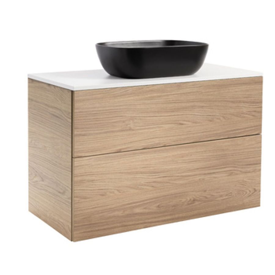 Isella underskåp med bänkskiva och ovanpåliggande tvättställ. Bänkskivan är gjord av kvartskomposit och tvättställ i porslin. Underskåpen har mjukstängande lådor. Mått (BxDxH) på tvättställ: Runt 415x415x135 mm och Rektangulärt 455x325x135 mm. Handtag beställes separat. Mått bakkant låda till vägg: 50 mm.