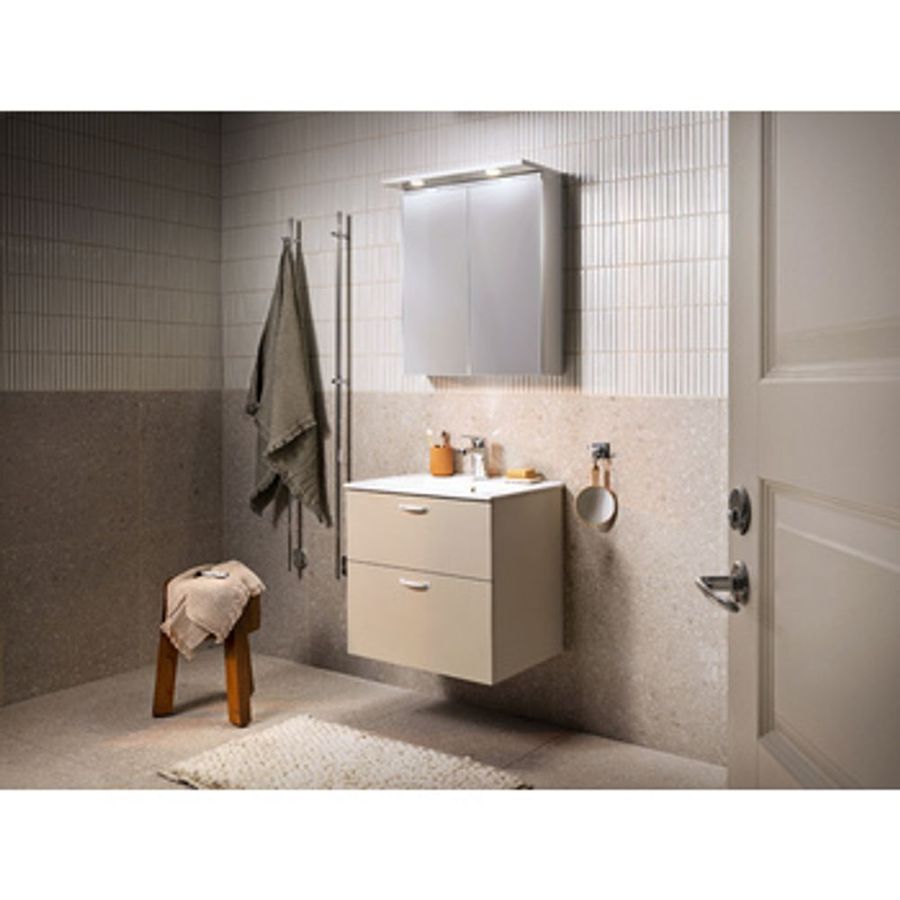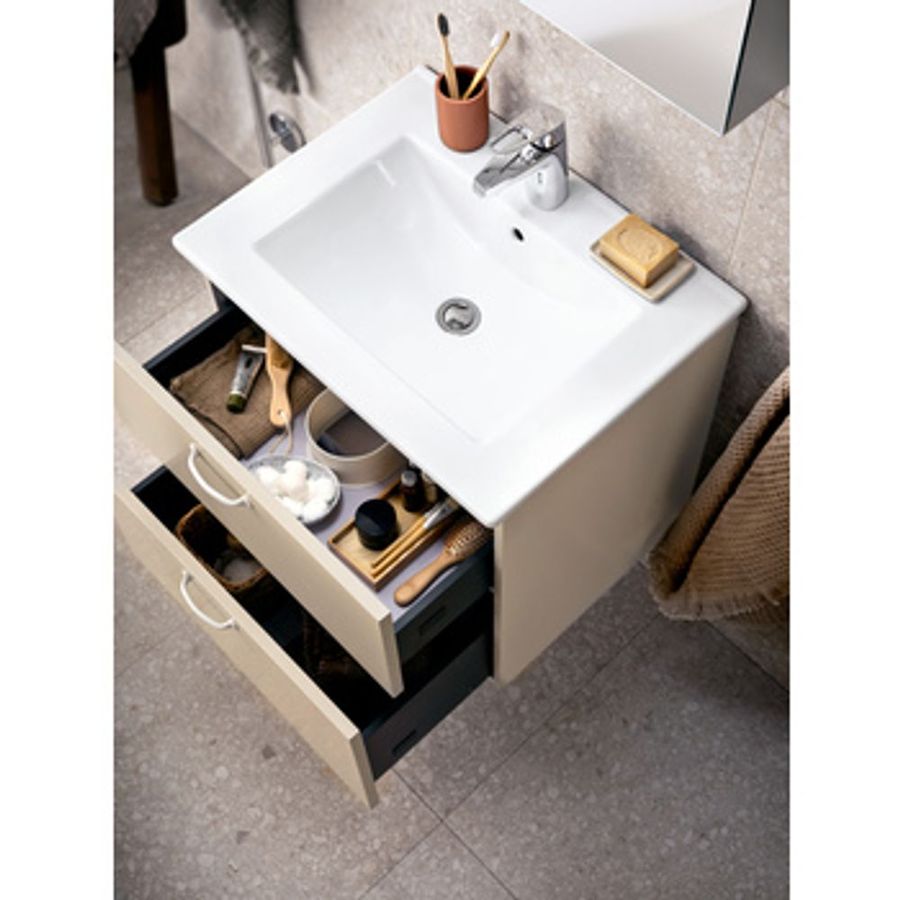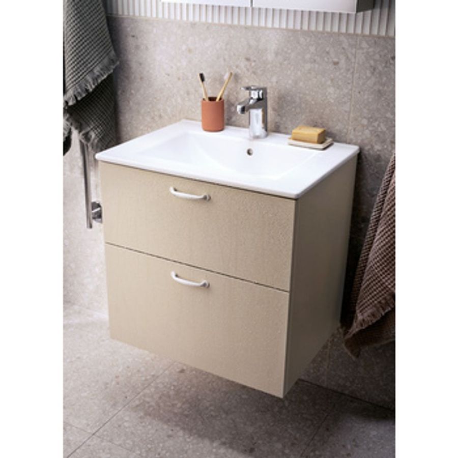 Isella Aqua underskåp med Ariella tvättställ i porslin eller mineralkomposit. Underskåpen är helt vattentåliga i termoplast med 2 mjukstängande lådor. Levereras färdigmonterade. Handtag beställs separat. Mått bakkant låda till vägg: 50 mm.