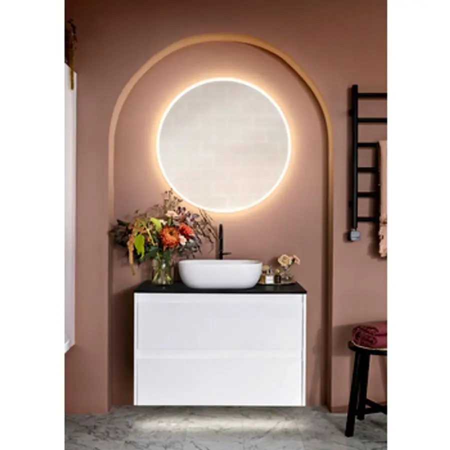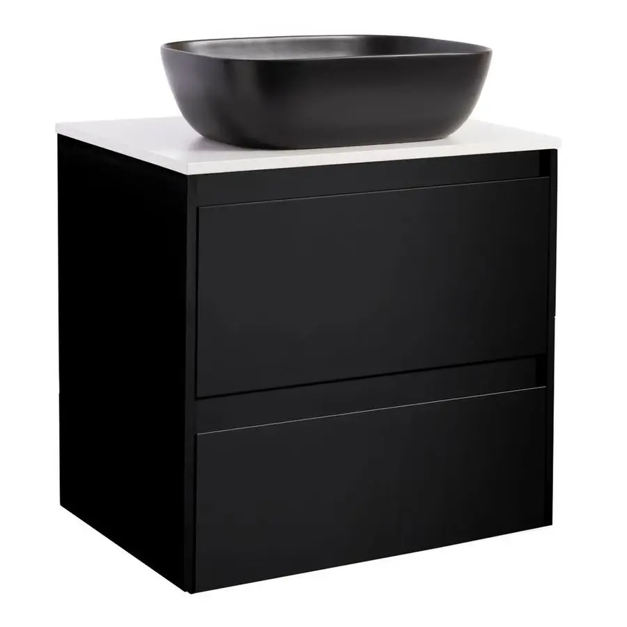 Luxor underskåp med bänkskiva och ovanpåliggande tvättställ. Bänkskivan är gjord av kvartskomposit och tvättställ i porslin. Underskåpen har mjukstängande lådor. Mått (BxDxH) på tvättställ: Runt 415x415x135 mm och Rektangulärt 455x325x135 mm.