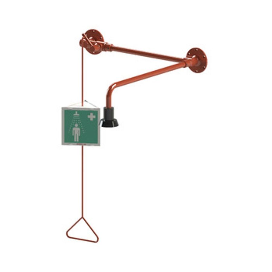 Kroppsdusch för väggmontage ovanför dörr med friliggande rörledningar, med självdränerande duschmunstycke. I mässing med kemiskt beständig BROENLAB Polycoat. Min. arbetstryck: 1 bar.