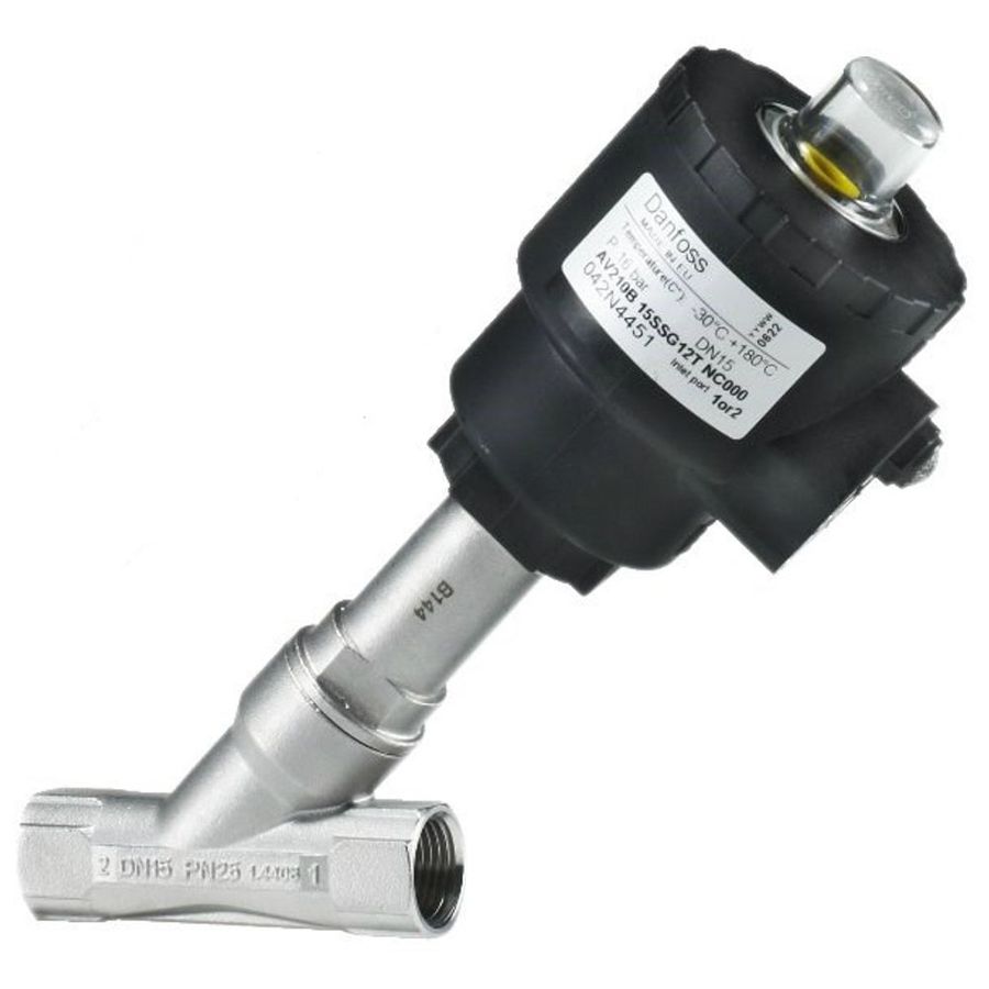 Pneumatisk styrd ventil. Tryck minst 0 kPa, max 1600 kPa. Medietemperatur -30 – +180 °C, tätning PTFE.