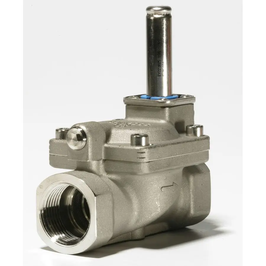Magnetventil, normalt stängd NC, FKM-membran, ventilhus syrafast stål, För aggressivare medier. Mediatemperatur: 0-100 °C, vatten max 60 °C. Tryck minst 30kPa, max 1000 kPa.