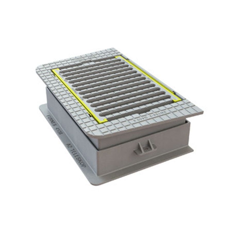 640 teleskop ram, typ A2 rännstensbetäckning, LongLife galler med slitsad packning och lås. Genomströmningsarea 1200cm2.