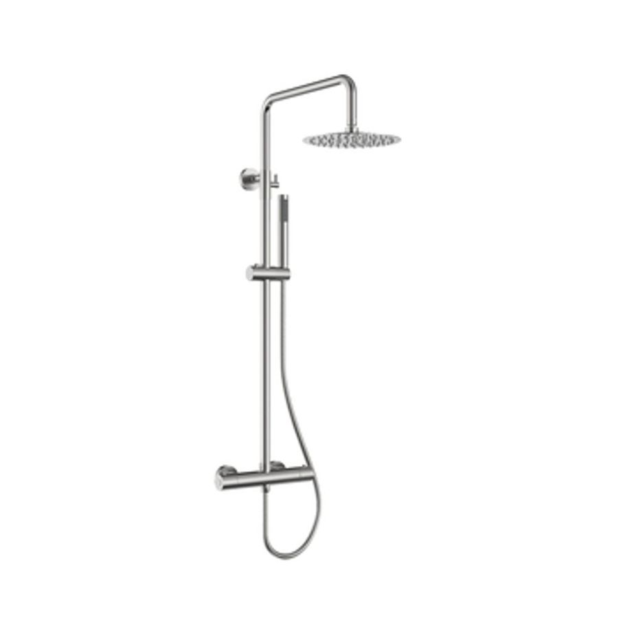 Temp och tryckstyrd duschtermostatblandare med takdusch och handdusch med PVC-fri slang. Justerbar i höjd och djupled.