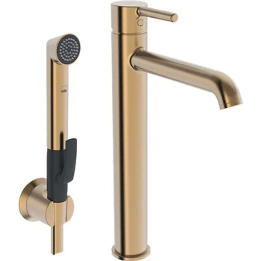Hög tvättställsblandare med en användarvänlig pinnspak samt självstängande bidetta handdusch, slang och väggfäste. Avzinkningshärdig 4MS mässing. F = flexibla anslutningar. Bygger på Oras 3.0 kassett med inbyggd flödes och temperaturspärr. Invändig gänga.