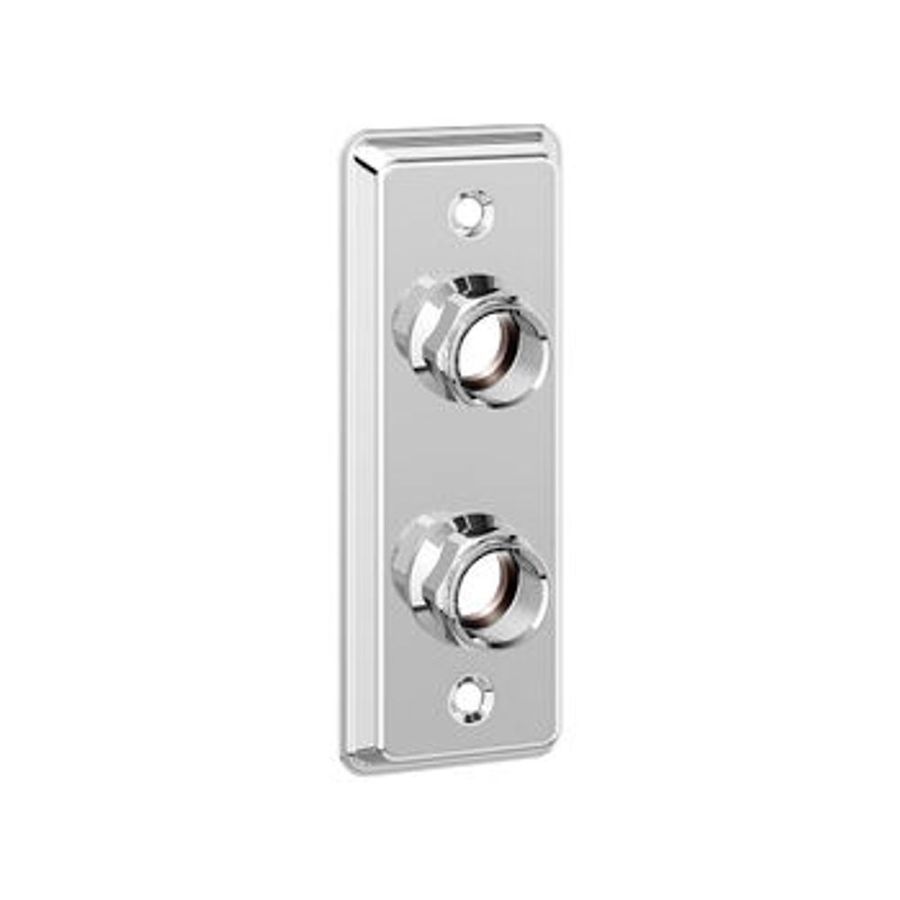Rostfri väggbricka för två rör med invändiga lekmuttrar 2xG20 där muttern är flexibel +/-1mm. Avsedd för Ø20 Pex/Alupex/Pb rör. G20 muttern måste kompletteras med för röret anpassad kopplingssats 1962053, 1962054 eller 1962054. VVS-skruv ingår. Brickan är modifierad till branschreglerna 2021, med plats för tätskikt.